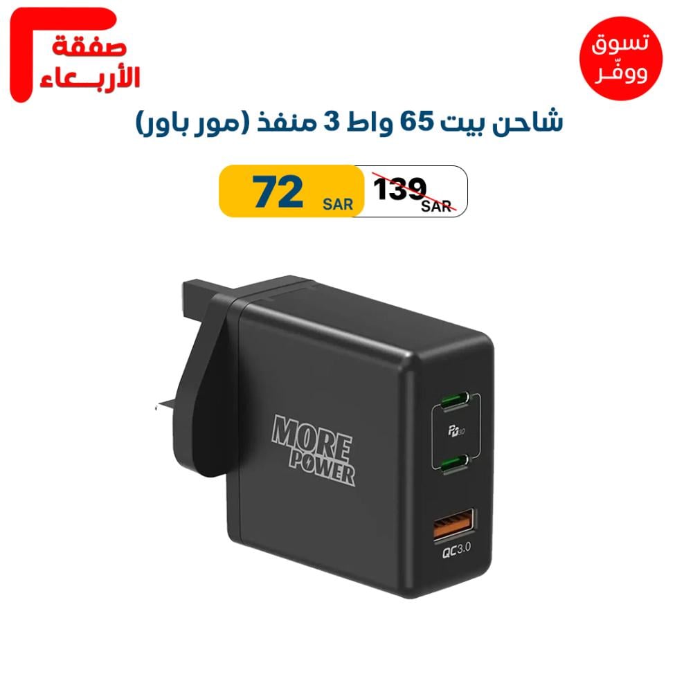 شاحن بيت 65 واط 3 منفذ (مور باور) - ضمان سنتين