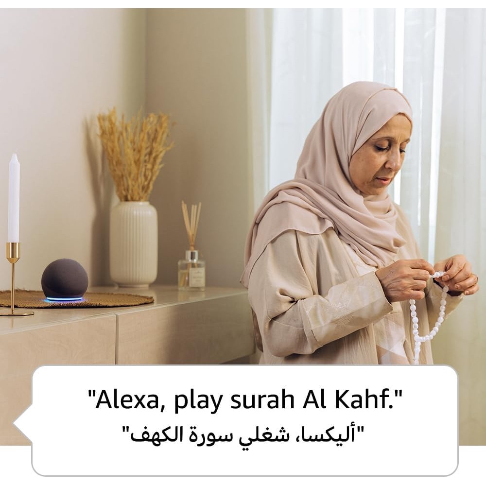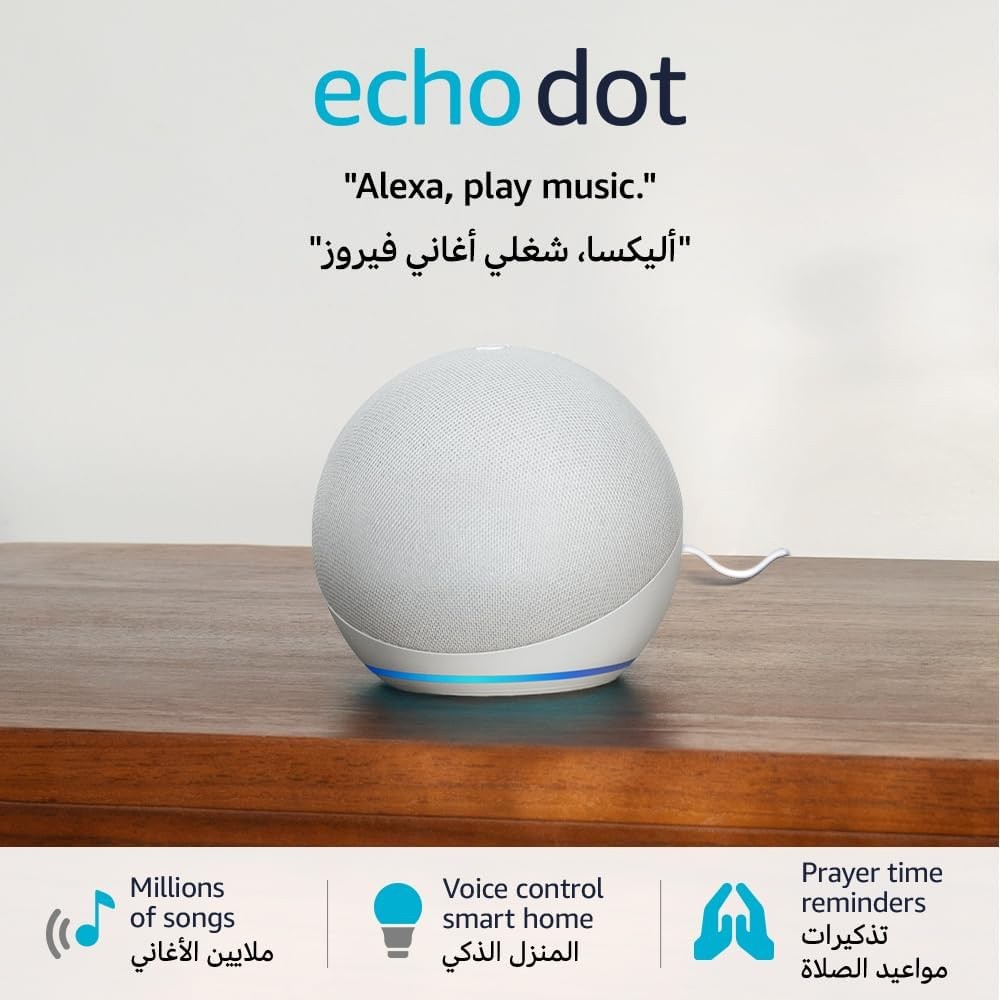 تتميز Echo Dot بأربع ميكروفونات للتحكم الصوتي بدون استخدام اليدين، حتى في الأماكن الصاخبة. يمكنك أن تطلب من أليكسا تشغيل/إطفاء الأنوار والأفياش الذكية، أو حتى ضبط درجة حرارة المكيف. يمكنك أيضًا تشغيل ملايين الأغاني والبودكاست والأناشيد من أنغامي وSpotify، واستخدامها في غرف مختلفة باستخدام خاصية multi-room music. أيضًا، يمكنك أن تطلب من أليكسا تلاوة القرآن الكريم وضبط التذكير بأوقات الصلاة والاستماع إلى الأذكار.