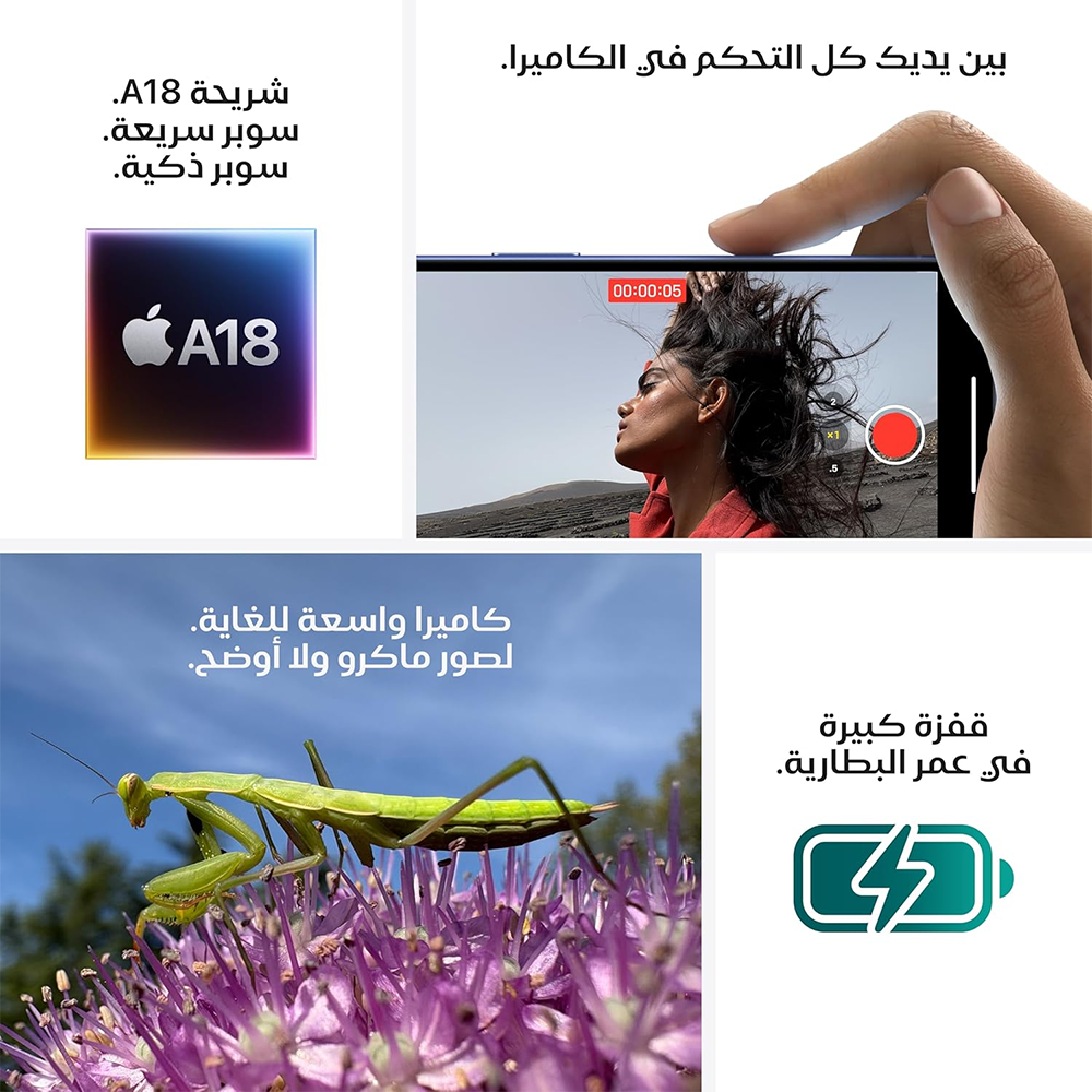 المعالج: معالج A18 من Apple، الذي يقدم أداءً سريعًا وكفاءة في استهلاك الطاقة.
